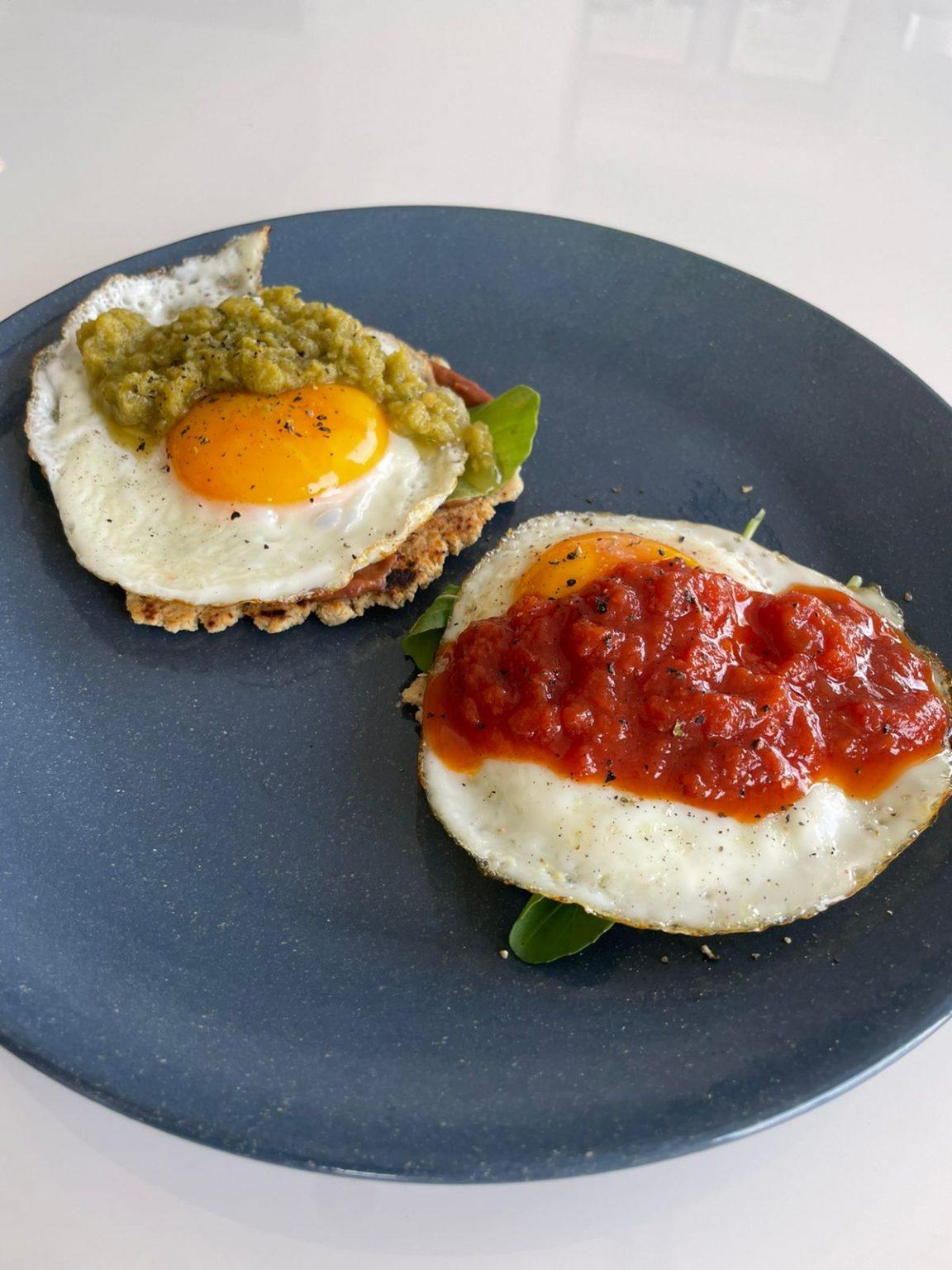 1 tortilla, 1 col. de sopa de pasta de feijão, a rúcula, o ovo e 1 col. de sopa de molho de tomate; se quiser pode finalizar com pimenta do reino moída na hora.
