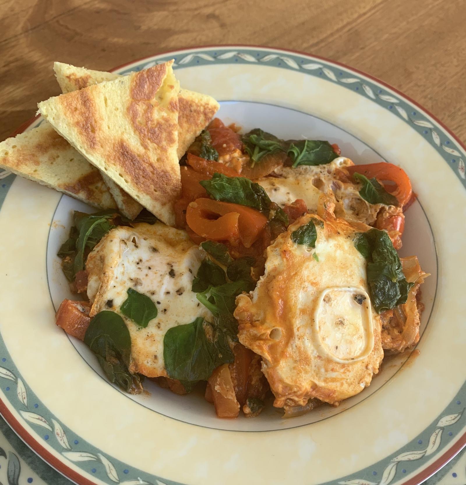 SHAKSHUKA(prato vegetariano com ovos, tomate, pimentão e espinafre)